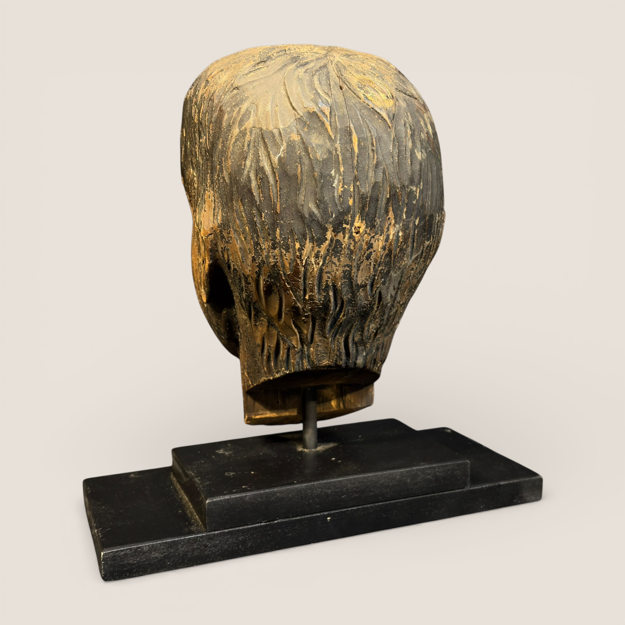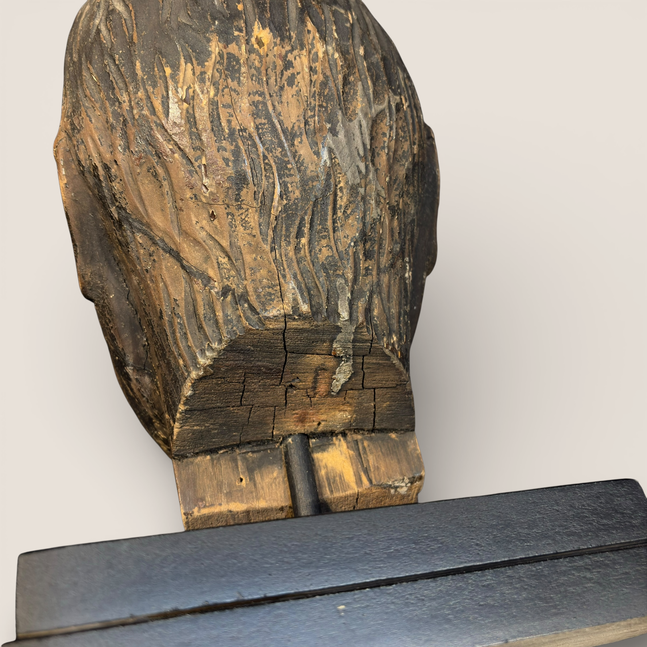 The carving exhibits strong hand-tool evidence throughout, with confident knife and gouge work visible across the hair, facial planes, and neck. The surface shows remarkable age and wear, with a rich, naturally developed patina and remnants of early surface coloration that enhance the sculpture’s presence and authenticity. Evidence at the base suggests the head was once part of a larger figure—possibly from a trade display, carousel or fairground figure, or architectural element—later preserved as a standalone object.
