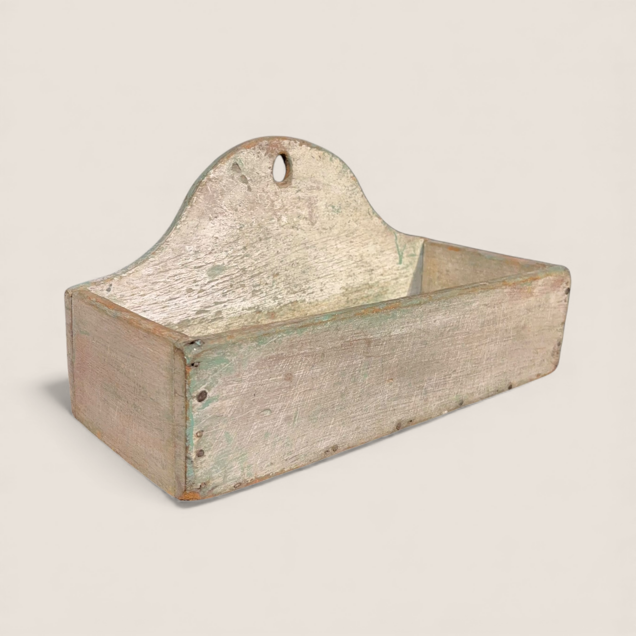 This early American wall box is a strong and honest example of country furniture, selected for its pleasing form, early construction, and exceptional painted surface. The box retains a dry, softly weathered white paint over an earlier blue-green ground, creating a layered surface with depth and subtle tonal variation that only time can produce.