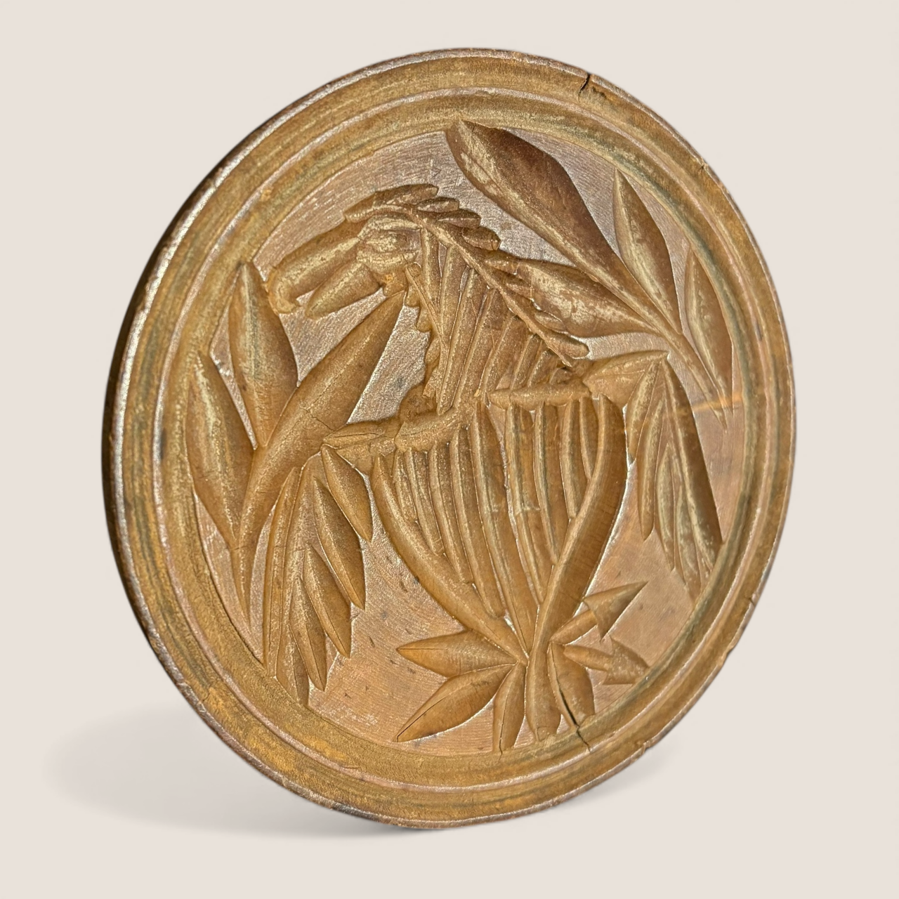 The surrounding field is enriched with crisp foliate carving, while the reverse retains its original knobbed handle, giving the piece a compact and purposeful form. Butter prints with explicit patriotic or martial symbolism are particularly scarce, making this an exceptional example.