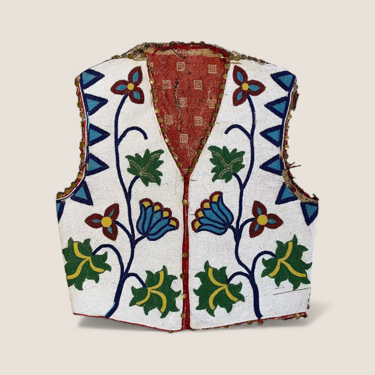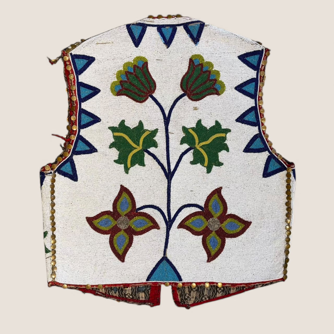 Scrolling vine forms culminate in stylized blossoms rendered in rich blues, greens, reds, and yellows, while the shoulders and side edges are accented with repeating geometric triangular devices, lending strong graphic contrast to the overall design. The vest retains its original cloth interior lining and is further enhanced by a perimeter of small copper buttons, an uncommon and particularly attractive detail seldom encountered on comparable examples.