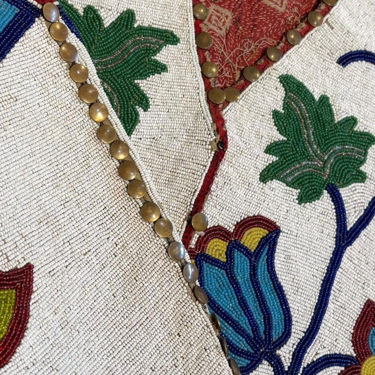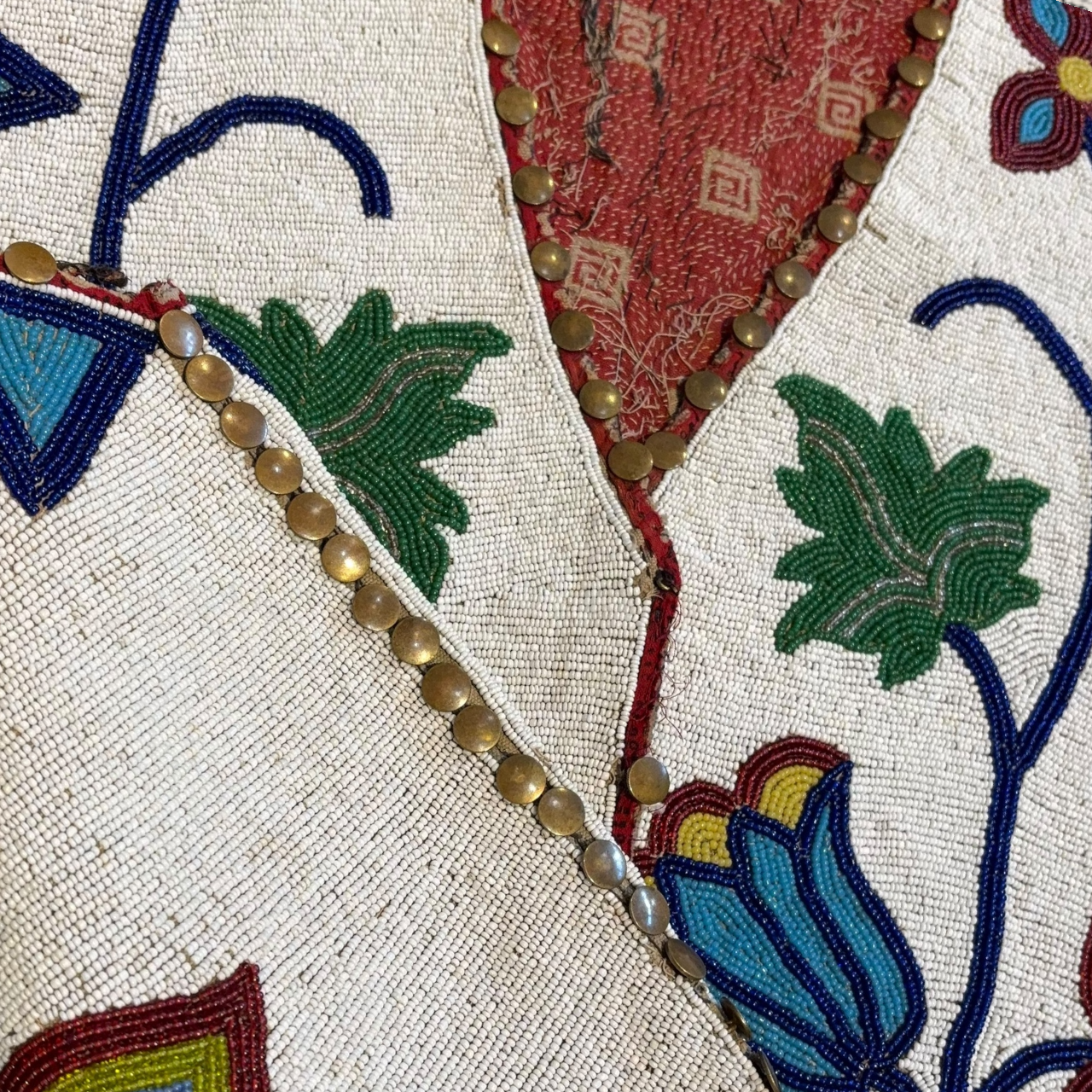 Condition is consistent with age and use, with minor bead loss and some loss to the copper buttons, yet the vest presents exceptionally well and retains strong visual integrity. Measuring approximately 21 inches across by 22 inches tall, this is a powerful and display-ready example of Plains beadwork from the late 19th century, well suited for an advanced collection of Native American art or Western material.