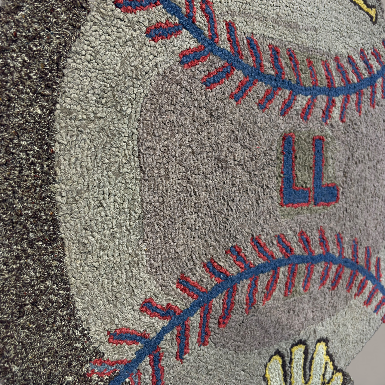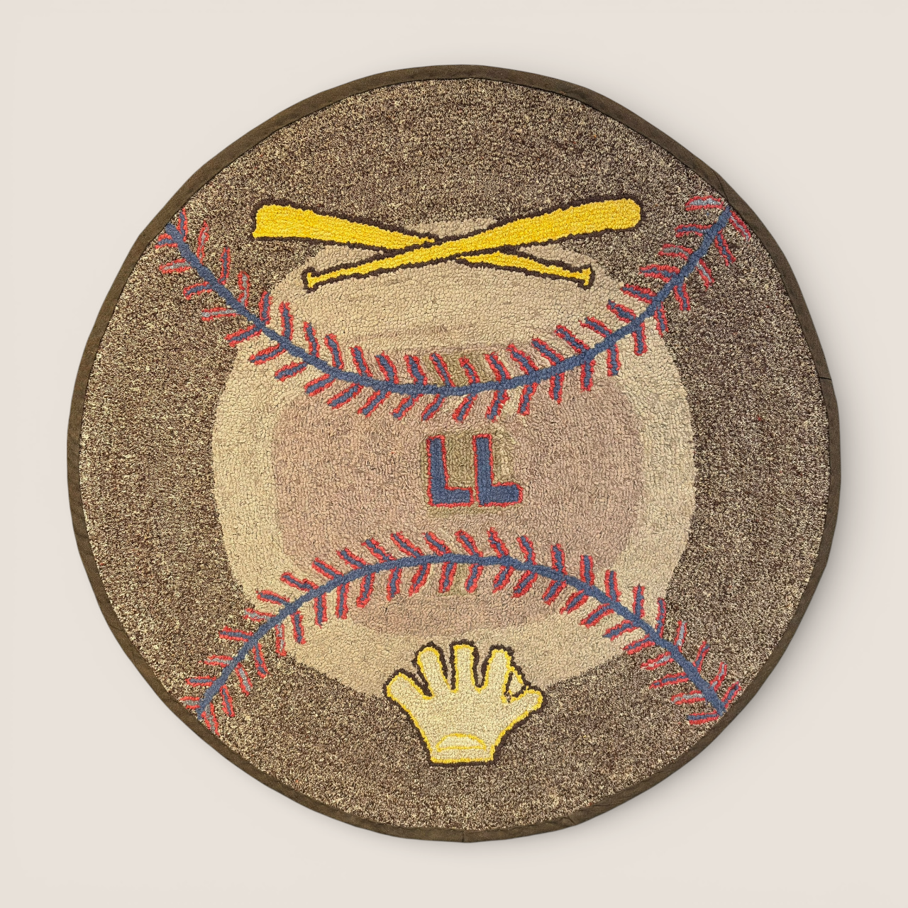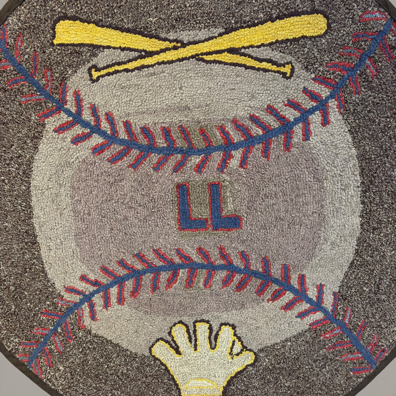 A striking and highly unusual American folk art hooked rug featuring bold baseball iconography, a subject seldom encountered within the canon of early hooked rug design. Executed in wool on a burlap foundation, the composition centers on a large baseball flanked by crossed bats and stitched red seams, with the initials “LL” prominently worked at center and a stylized glove motif below.
