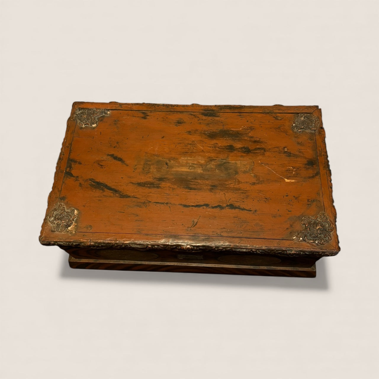 Measuring 19.5 x 11.5 x 7.5 inches, this remarkable 19th-century box is a tour-de-force of early American decorative arts. The surface features bold faux-grained paint decoration, with tiger-stripe graining on the base and sides. The lid is framed with deeply carved foliate molding incorporating alternating leaf and shield motifs, lending a strong neoclassical and architectural presence.