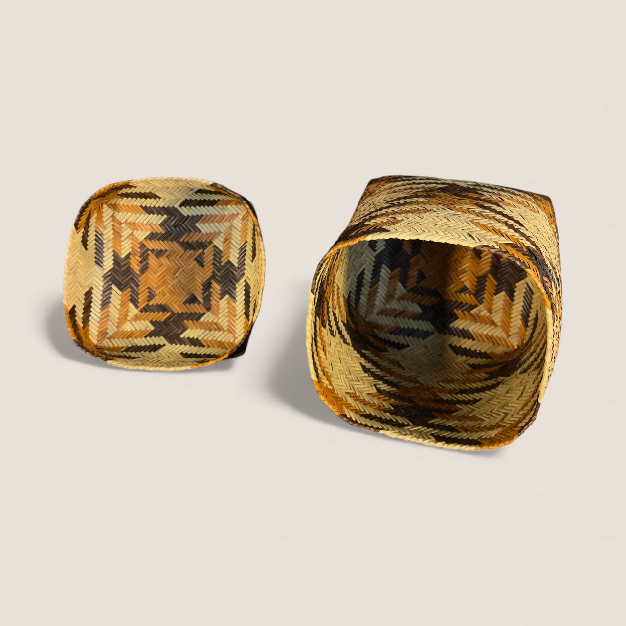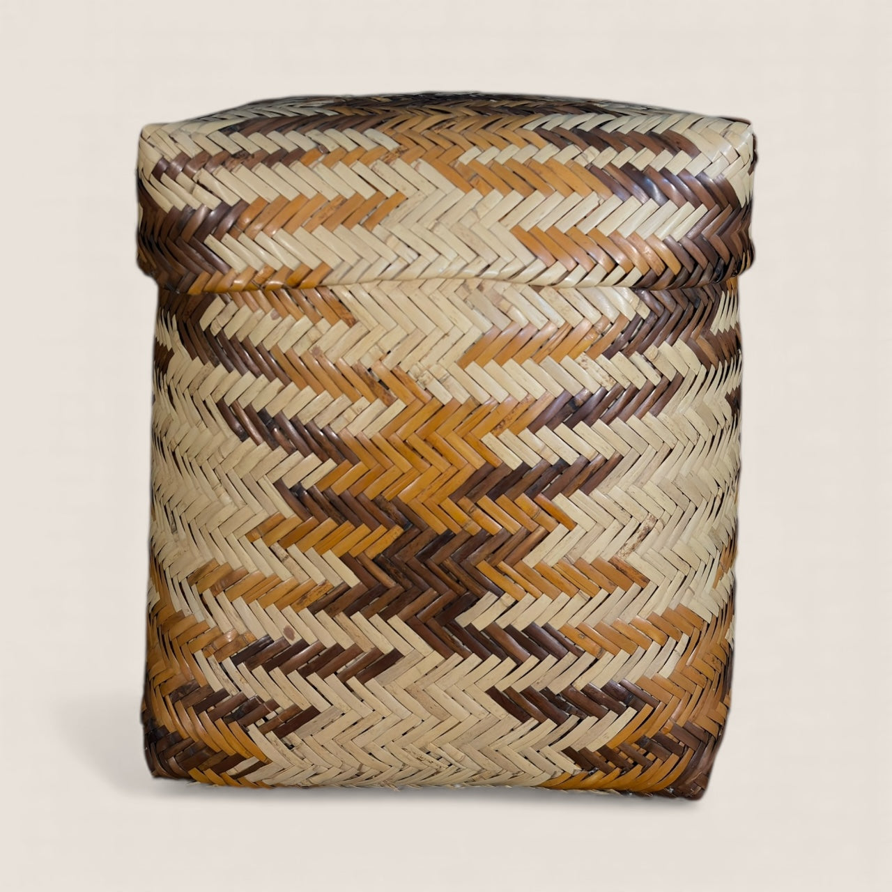 An extraordinary and monumental Cherokee rivercane basket by master weaver Rowena Bradley (1922–2003) — one of the most celebrated basket makers of the 20th century. This exceptional example features a perfectly proportioned square form with tightly fitted lid, woven in bold zig-zag “peace pipe” pattern in natural, dark brown, and golden-dyed cane.