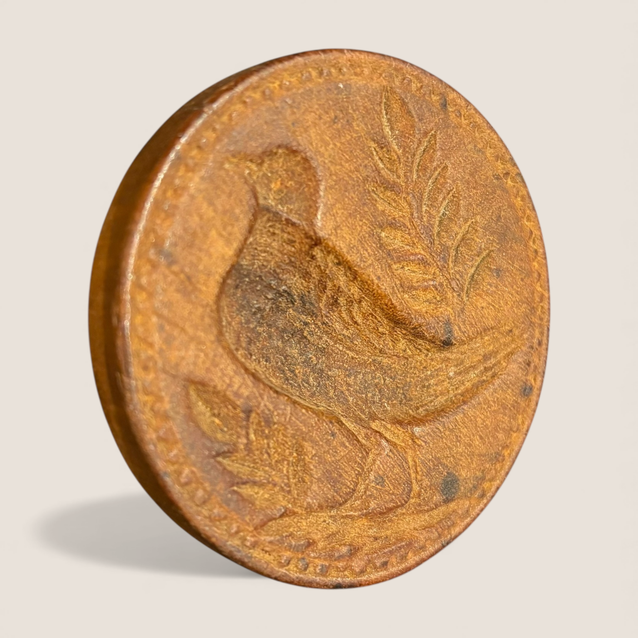 A charming and scarce miniature 19th century carved wooden butter print, featuring a simplified bird motif within a compact circular format. Despite its reduced scale, the carving is crisp and assured, with clean, confident cuts that demonstrate the carver’s skill and economy of line.