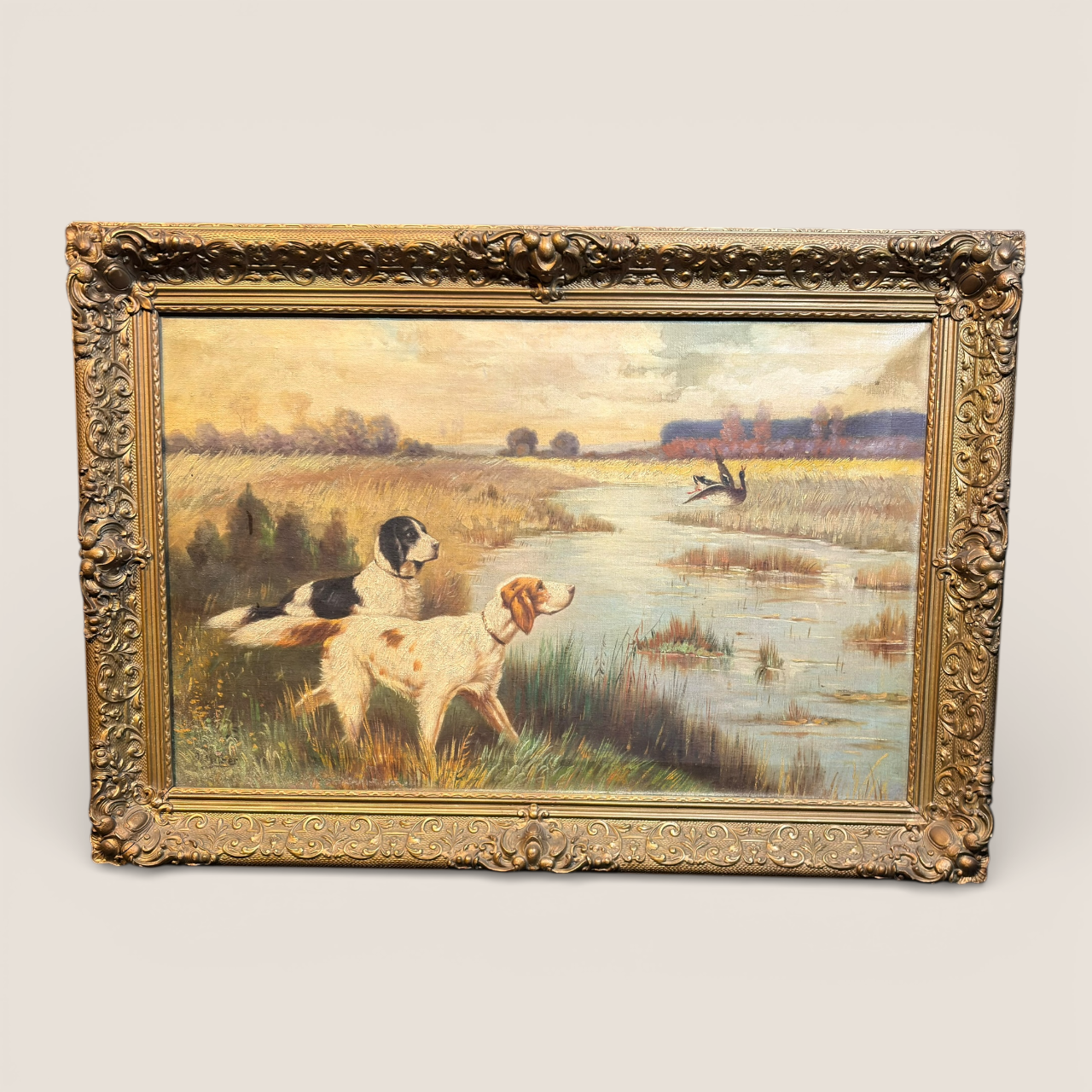 The painter demonstrates a confident academic hand, with particularly fine attention paid to the texture of the dogs’ coats, the reflective surface of the water, and the golden tones of the autumn marsh landscape. The warm, luminous sky and soft horizon line evoke the influence of late 19th century American sporting and landscape traditions, where scenes of field and hunt were rendered with both realism and romanticism.