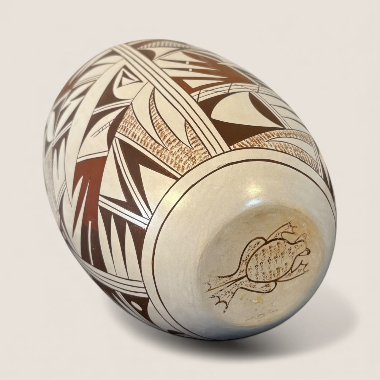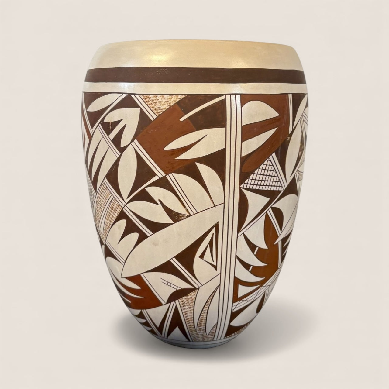 One of the best examples of Joy Navasie's work you will find. An exceptionally larger sized vase measuring 10 inches tall x 7 inches in diameter. Signed at bottom with an old price tag - $2600. In excellent condition.